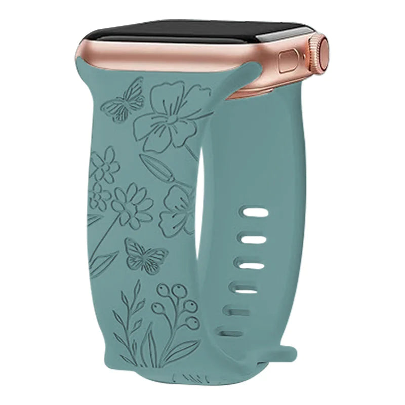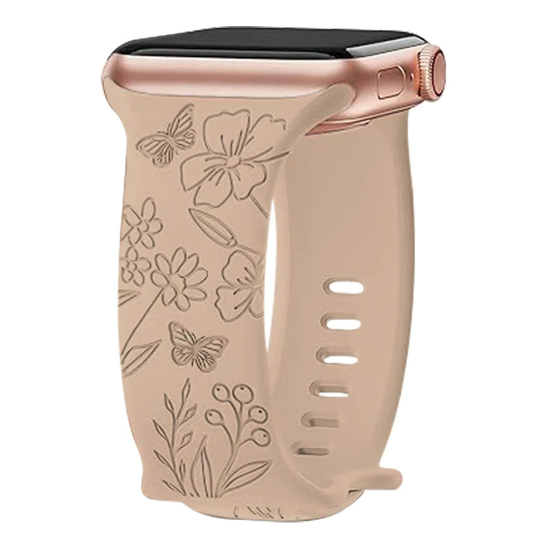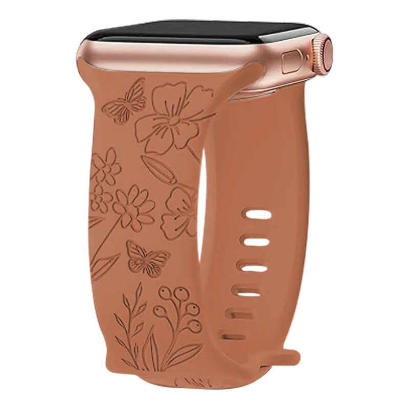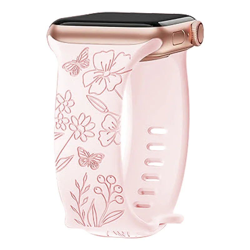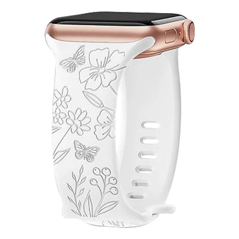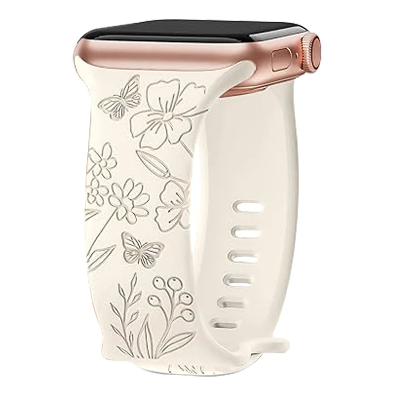Add a touch of elegance to your wrist with this laser-carved silicone strap featuring a brocade flower pattern and butterfly clasp. Designed for comfort and charm, it suits both casual and dressy looks.