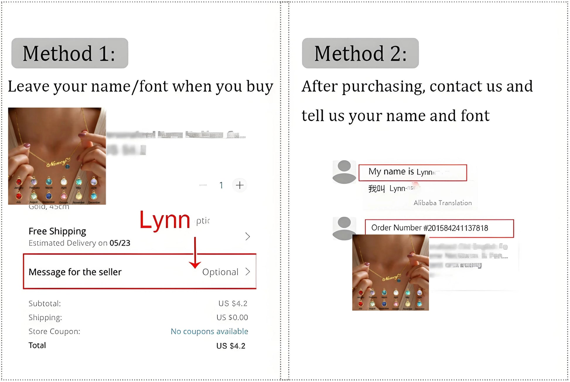 At checkout, leave your customization details in the “Order Notes / Note box.”