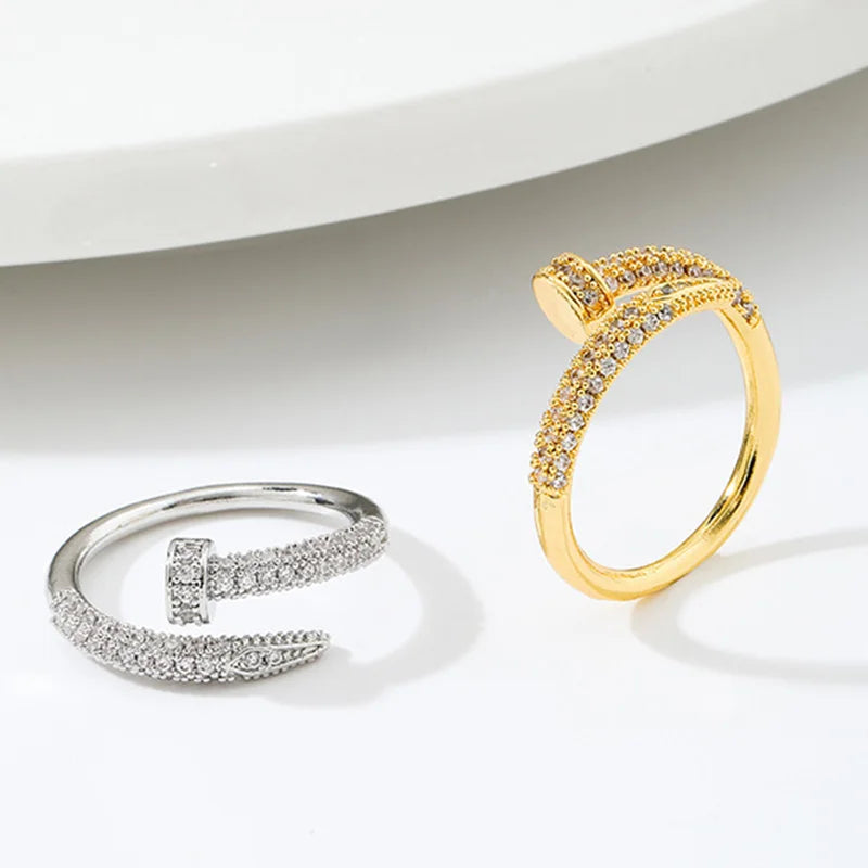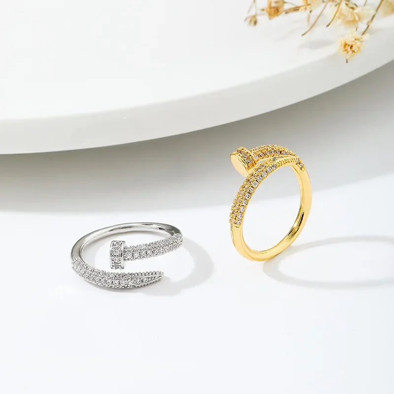 Inspired by a sleek nail-style silhouette, this adjustable ring features sparkling zircon accents that catch the light beautifully. Its open design offers a comfortable, flexible fit while adding a contemporary touch to both everyday and evening looks.